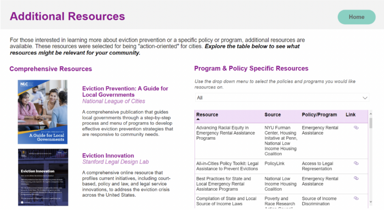 In addition to information on cities and their policy and program actions, the researchers have also complied a growing list of program-specific resources to help city leaders take the next step in making an eviction prevention policy or program a reality in their community. “Action-oriented” resources were prioritized for inclusion.