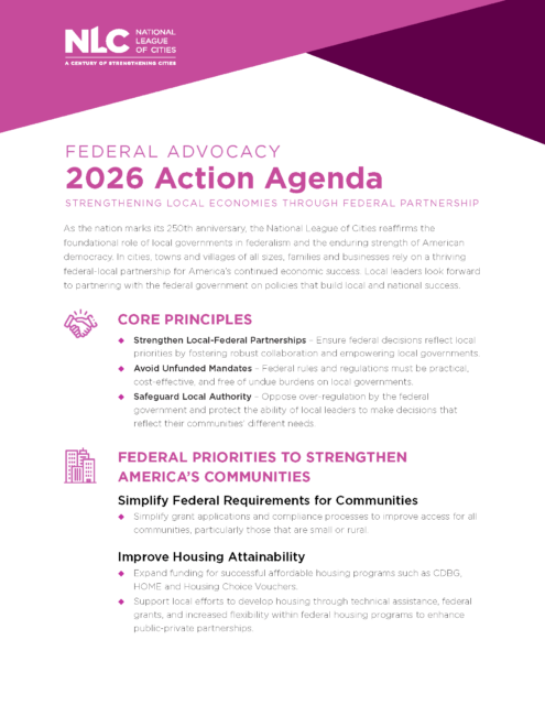 NLC has a biannual agenda mapped to the Congressional cycle to guide local advocacy efforts on Capitol Hill and with the Administration. Learn more about the issues that matter most in your community. View our 2026 Federal Action Agenda below.